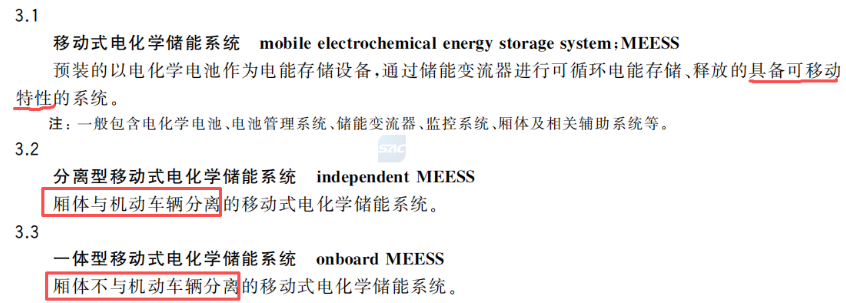 ?。?)《移動式電化學儲能系統(tǒng)技術規(guī)范》GB∕T 36545-2023第3.1-3.3條:移動式電化學儲能系統(tǒng)是具備可移動性的系統(tǒng),分為一體型移動式電化學儲能電站和分離型移動式電化學儲能系統(tǒng)。